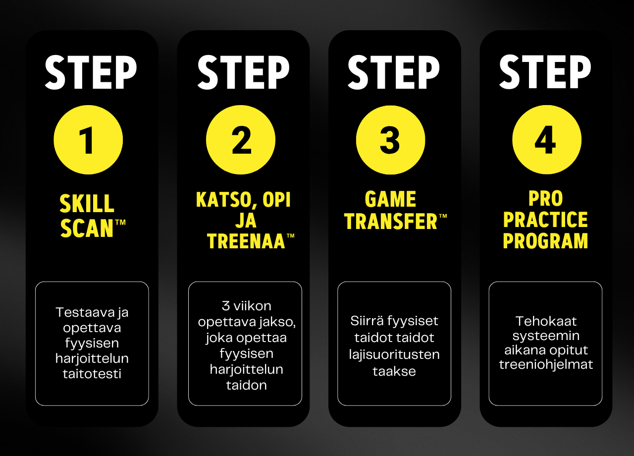 Alla olevasta kuvasta näet (4) neljä tehokasta ja ainutlaatuista vaihetta, joita et löydä mistään muusta valmennuksesta et Suomesta, etkä maailmalta.